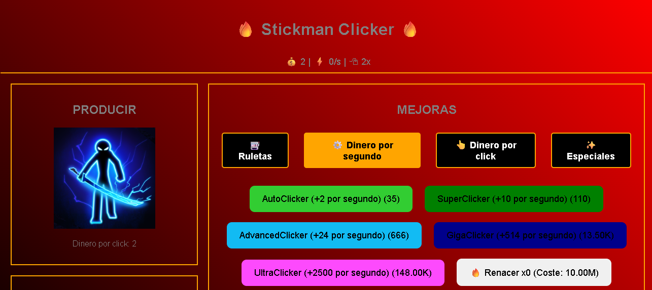 Alerta: creado por alguien principiante en programación, puede haber algo error y muchos cambios. juego incremental donde debes hacer clic para generar dinero, comprar mejores y renacer. Mejora tu producción, gira ruletas de la suerte, renace para volverte más fuerte y consigue monedas especiales para obtener habilidades únicas.